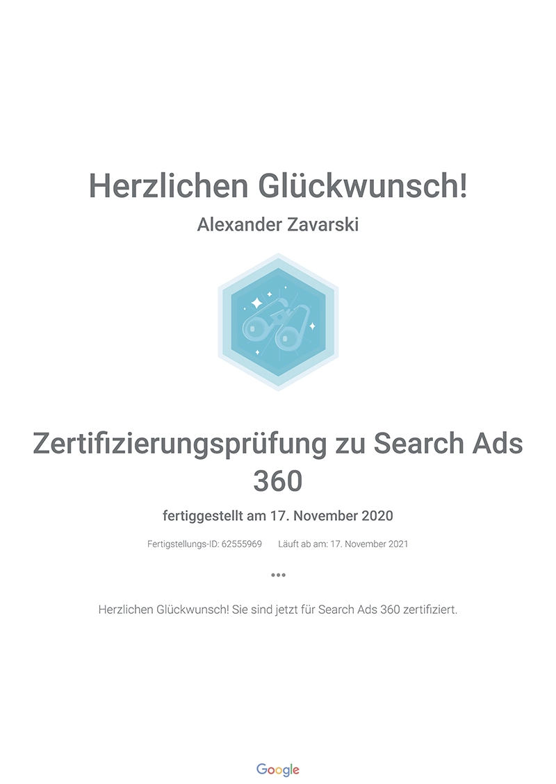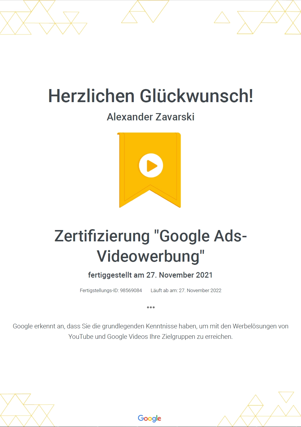 Die Google-Zertifizierung für Videowerbung bestätigt die Qualität unserer Dienstleistungen.